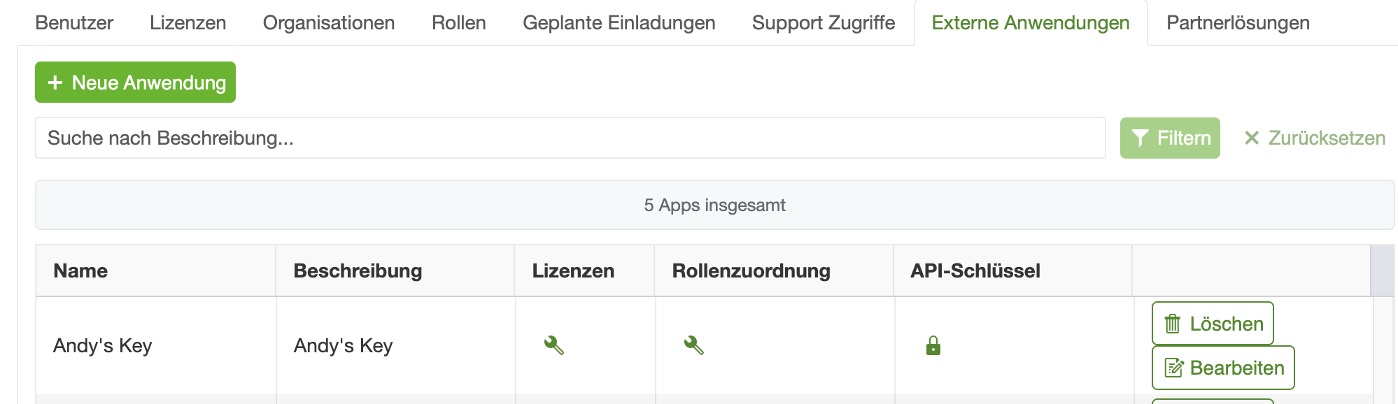 To work with our BRZ 365 APIs you need to obtain an API-Key from our BRZ 365 Administrator. As a Administrator you can create a new API-Key under external applications ("Externe Anwendungen"), manage access and permissions for that API-Key.